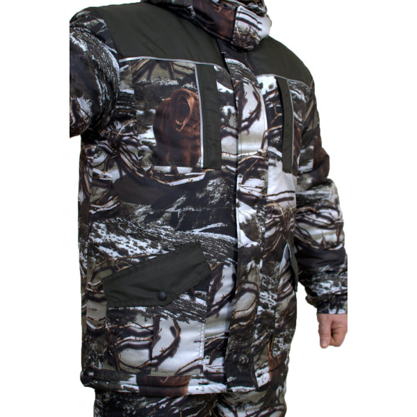 Костюм зимний состоит из полукомбинезона и куртки. Основная и отделочная ткань таслан . Показатели мембраны 3000/3000. Куртка удлиненная на молнии с ветрозащитным клапаном на липучке. Утеплитель термофин. Подкладка флис. Капюшон на молнии. На куртке пять карманов - два нагрудных врезных на молнии, два накладных на кнопках и один внутренний для документов на липучке. Полукомбинезон на двухзамковой молнии. Два кармана врезных и два кармана нагрудных накладных на кнопках. Утеплитель термофин, подкладка таффета. Колени дополнительно усиленны тасланом. Костюм имеет анатомический крой, не стесняет движений. Комфортная температура эксплуатации до минус 30 градусов. Костюм подойдет для рыбаков, охотников и любителей активного зимнего отдыха.